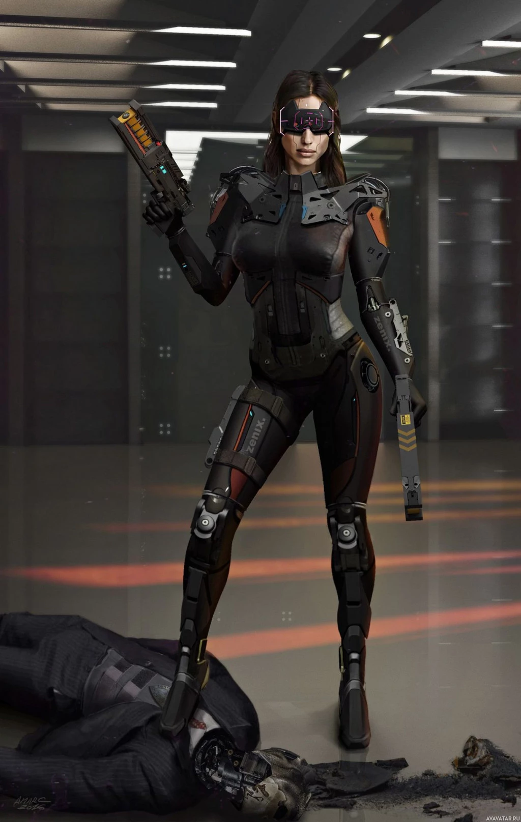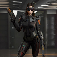 an indoor setting, possibly a futuristic or science fiction environment. The individual is wearing a full-body suit that combines elements of
