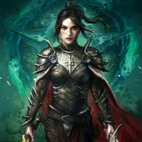 an intense expression on her face, suggesting she might be in the midst of battle or preparing for it. The background features a mystical or magical symbol, which adds to