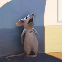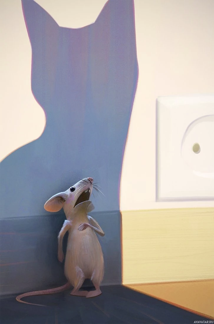 animated characters. On the left side, there is a mouse who appears to be in distress or fear, possibly due to the presence of