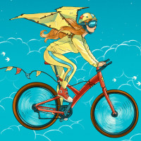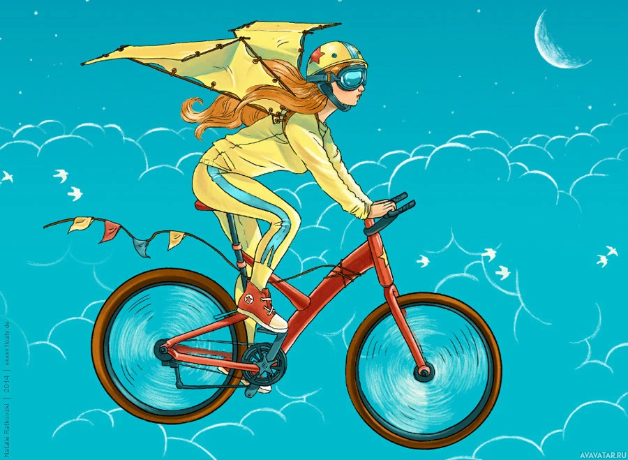 The image depicts a girl riding a bicycle in mid-air. She appears to be flying or soaring, possibly with the help of
