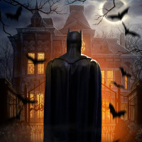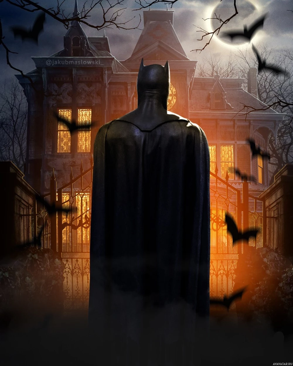 На картинке изображен персонаж, стоящий перед домом с привидениями ночью во время Хэллоуина, на что указывают освещенные фонари и многочисленные летучие мыши, летающие в небе. Персонаж одет в черный капюшон и плащ, которые являются знаковыми элементами костюма Бэтмена.