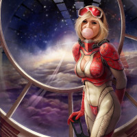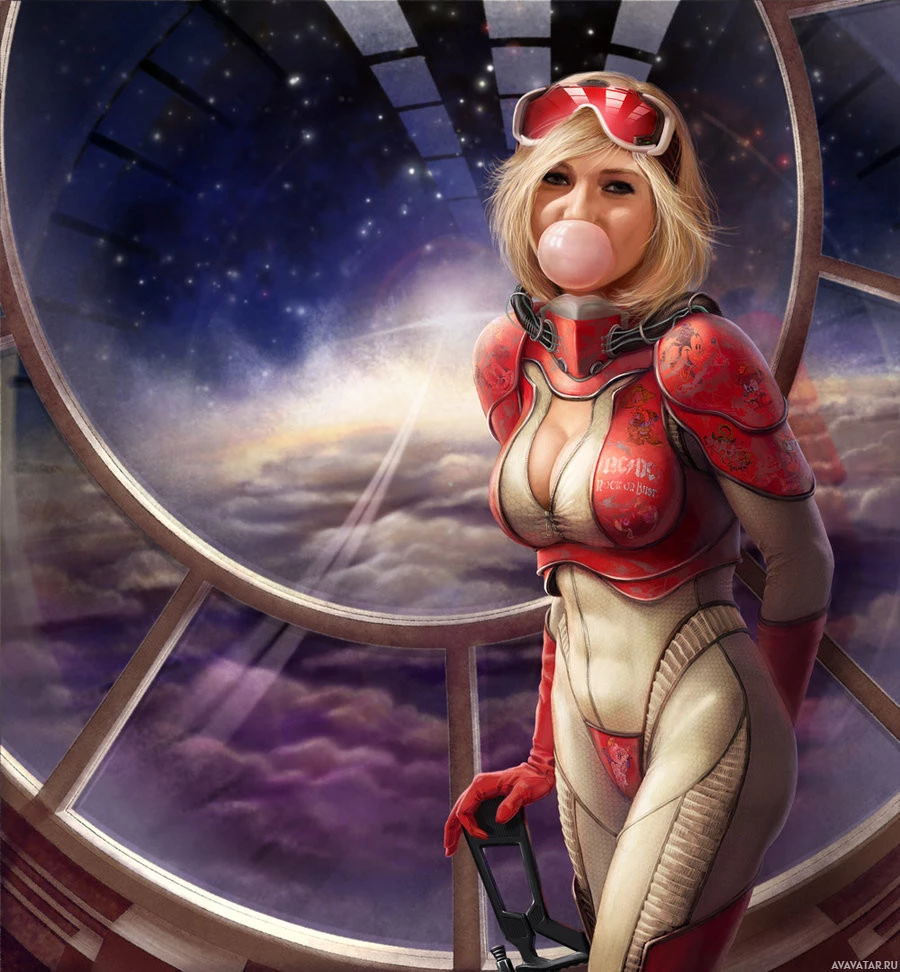 На картинке изображен женский персонаж с светлыми волосами, одетый в костюм на тему научной фантастики. Она стоит перед круглым порталом, который находится внутри космического корабля или космической станции. Обстановка предполагает футуристическую или внеземную среду.