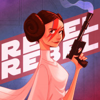 the Star Wars franchise. She is holding a blaster and appears to be in a stylized or comic book-like art style rather than