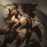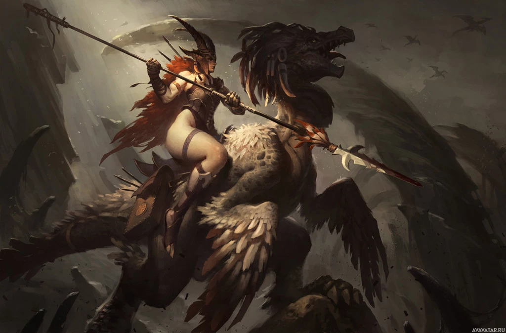 a fantasy scene with a character riding on the back of a creature that resembles a dinosaur. The character is holding a lance and appears to be engaged in combat, possibly defending against an attacking force. The setting has a dark,