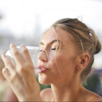 На снимке изображена женщина, которая, похоже, наслаждается стаканом воды. Она закрыла глаза и, похоже, наслаждается моментом, возможно, отдыхает от принятия солнечных ванн или других видов активного отдыха. Обстановка располагает к непринужденной обстановке, возможно, во внутреннем дворике ресторана или в баре на берегу моря.