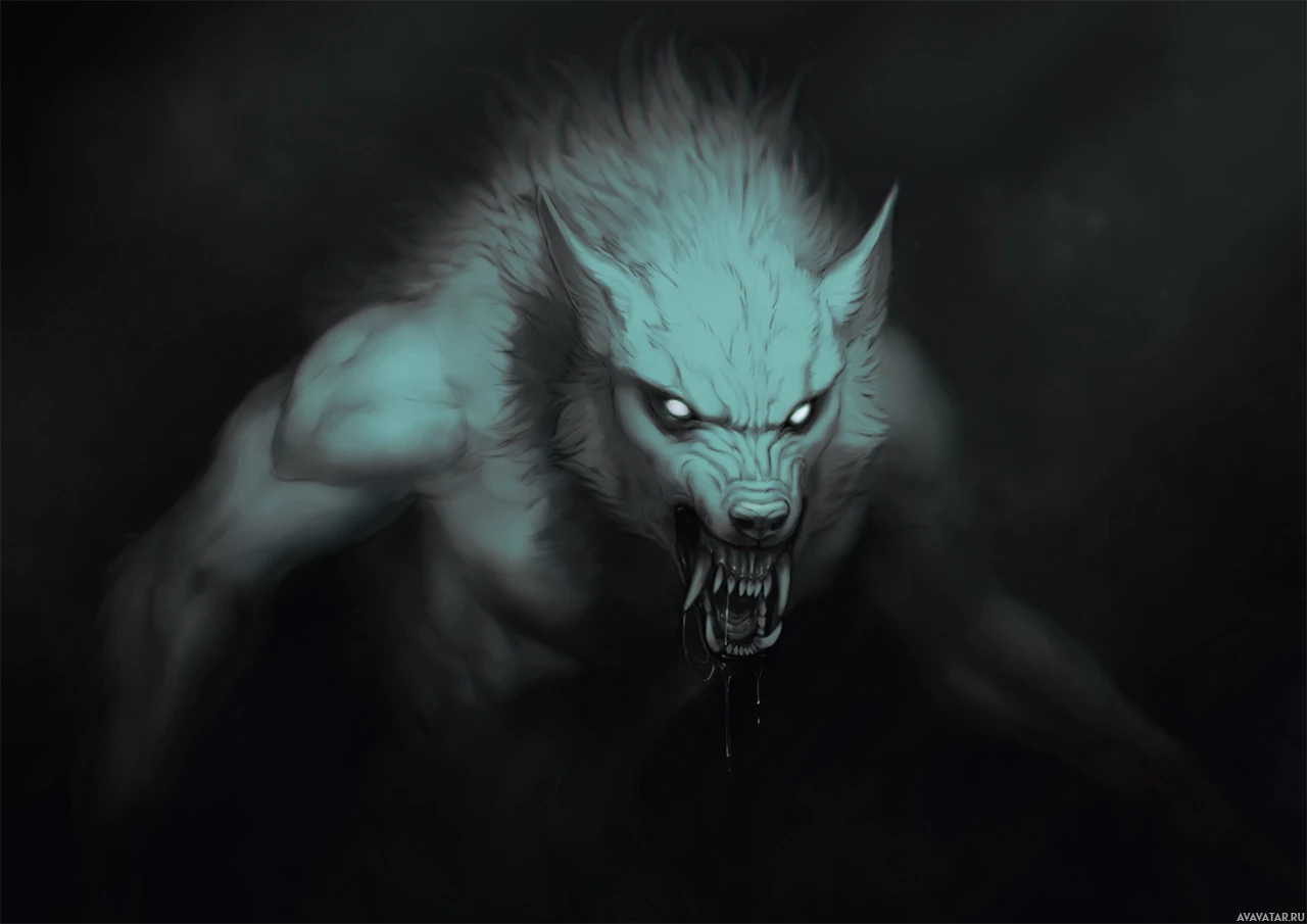 The image features a fantasy-themed illustration of a werewolf. The werewolf is depicted in an aggressive or menacing pose, with its mouth open as if roaring or growling. Its fur is shown to be primarily white, which contrasts with