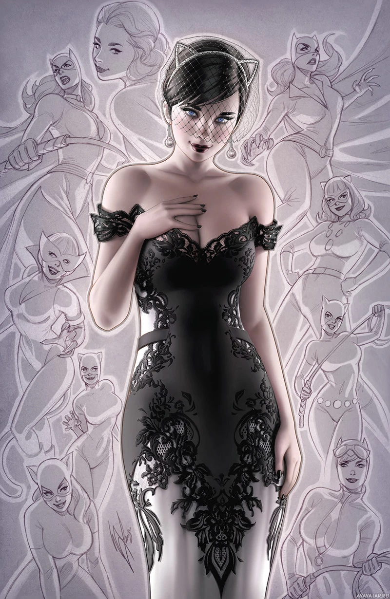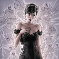 black dress with intricate designs on the bodice, suggesting she might be attending a formal event or engaging in a high-end setting. There are several other characters and figures present in the background, some of which seem to resemble demons or