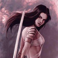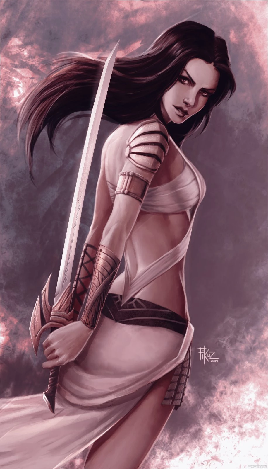 The image features a female character who appears to be a warrior or an adventurer. She has long, dark hair and is holding a sword in her right hand. Her attire suggests she could be from ancient times or a fantasy setting.