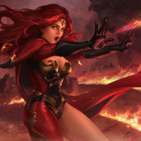 red hair and is wearing a costume that consists of a black and gold bodysuit, with red accents on her shoulders, thighs, and hips. The costume appears to be designed for combat or adventure, suggesting she might be a warrior or an adventurer in her narrative context. The setting includes flames and volcanic-looking terrain, indicating a high-