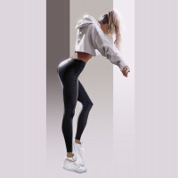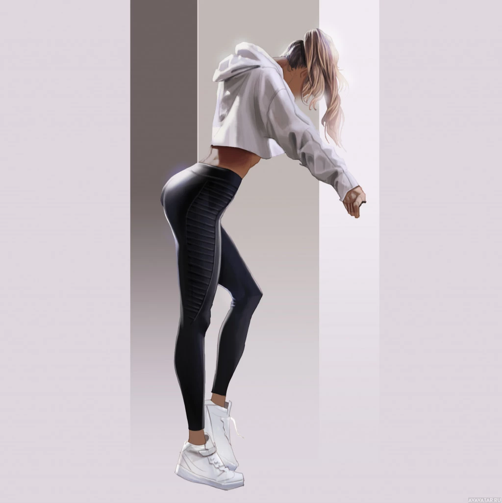 black leggings, with the hood up on her head. Her arms are crossed in front of her body and she is looking down at what appears to be a phone or some other device that is not visible in the image. She has one foot slightly raised as if she is mid-stride, suggesting movement or exercise. The style of the illustration seems modern and sleek, with a focus on