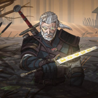 dangerous creatures from the game's world. The character is equipped with a sword, suggesting he may be preparing for combat or exploration. The overall atmosphere of the image conveys a sense of danger and adventure typical of the "Witcher" games.