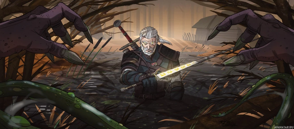 video game series. It features a character who appears to be Geralt, standing in a swampy or marshy area with mist and