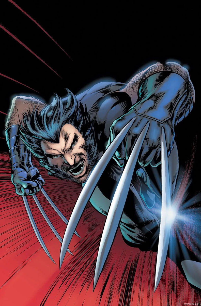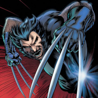 the X-Men comics. He is depicted in an action pose with his claws extended and bared teeth, suggesting he might be engaged in combat or confrontation. The background has a dynamic,