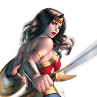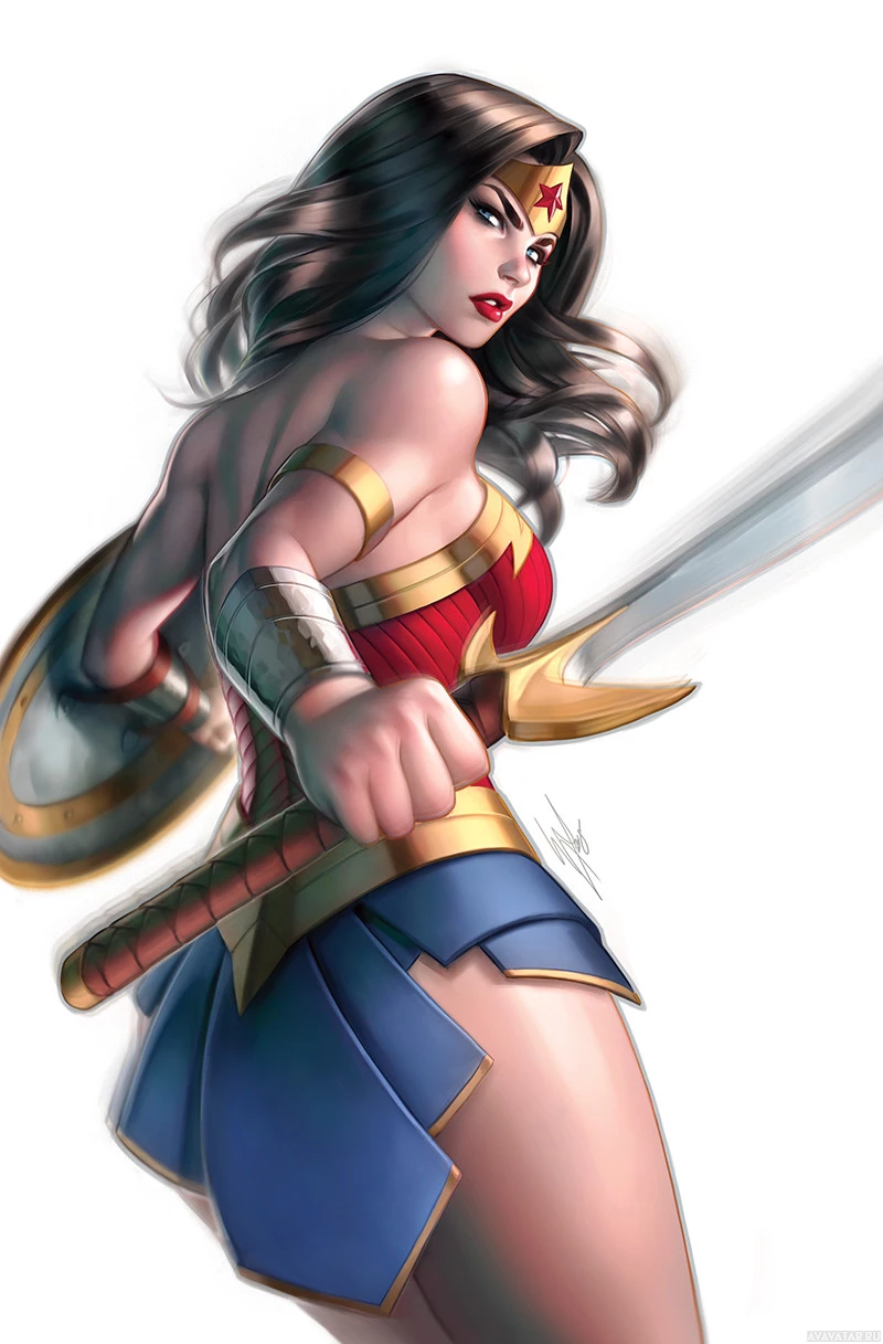 The image depicts a stylized illustration of Wonder Woman, a popular character from