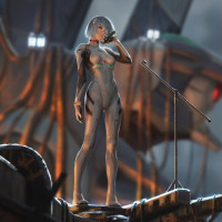 mechanical structures with cables and pipes in the background, suggesting that this could be a scene from a post-apocalyptic or dystopian future. She holds a microphone and is singing or speaking into it, which implies she might be part of a performance, announcement, or event.