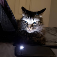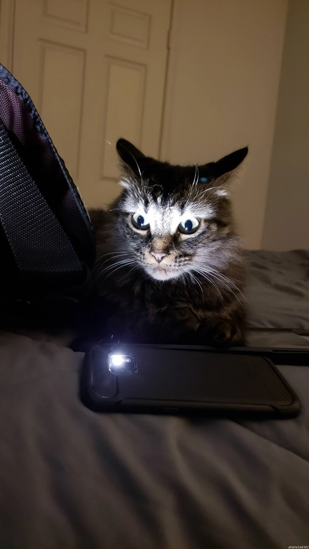 The picture shows a cat sitting on what appears to be a bed or couch. The cat is looking directly at the camera with