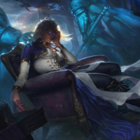 a fantasy setting, sitting on what looks like a throne with an ornate backrest. Surrounding her are various elements of a mystical or magical environment, including