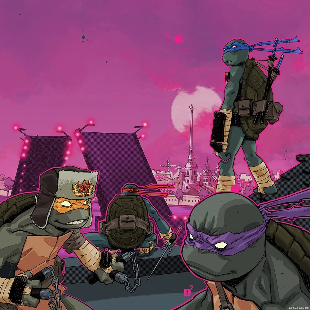 Mutant Ninja Turtles franchise. There is one character standing in a commanding pose, another with