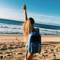 blonde hair, and she is wearing a blue backpack. She seems to be in a happy or excited mood, as indicated by the raised arm gesture. The setting includes