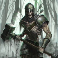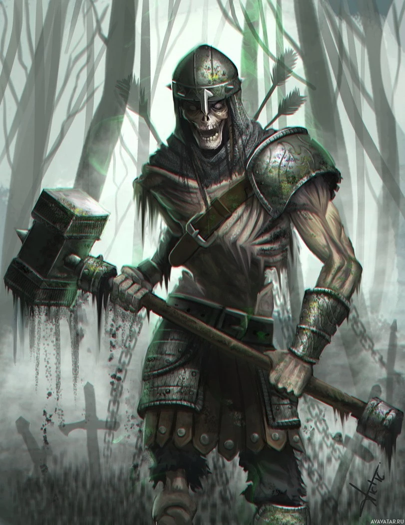 a fantasy character that appears to be a zombie warrior. This character is standing in what looks like a dark,