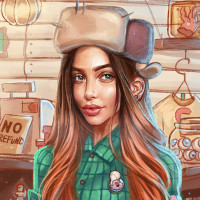 blue eyes. In the background, there are shelves stocked with various items, including what appears to be