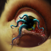 The image shows a close-up of a person's eye, with an octopus emerging from the pupil. It appears to be an artistic or surreal depiction rather than a real-life scenario.