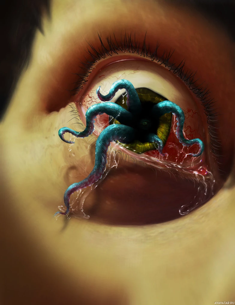 Картинка показывает крупный план глаза человека, с осьминогом, выходящим из зрачка. Это скорее художественное или сюрреалистическое изображение, чем реальный сценарий.