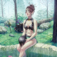 a fantasy scene featuring an elf sitting in what appears to be a shallow body of water, possibly a lake or pond, on a rainy day. The elf is wearing a light-colored top and has her legs crossed as she sits with her knees pulled up to her chest. She is looking down at something in her lap. The environment around her is lush and natural, with trees and rocks visible. There are also what appear to be