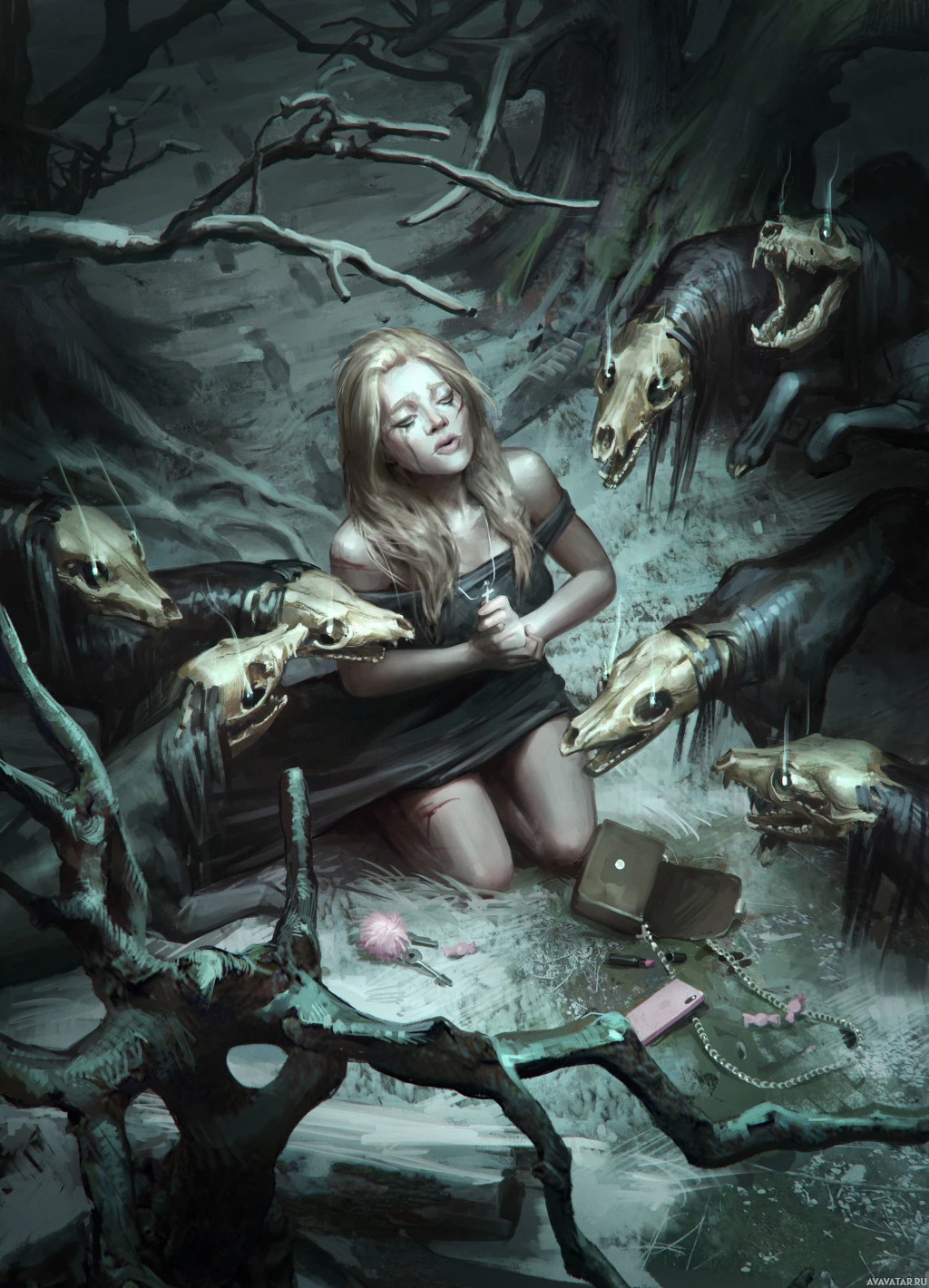 a dark forest or undergrowth, which adds to the eerie atmosphere of the scene.