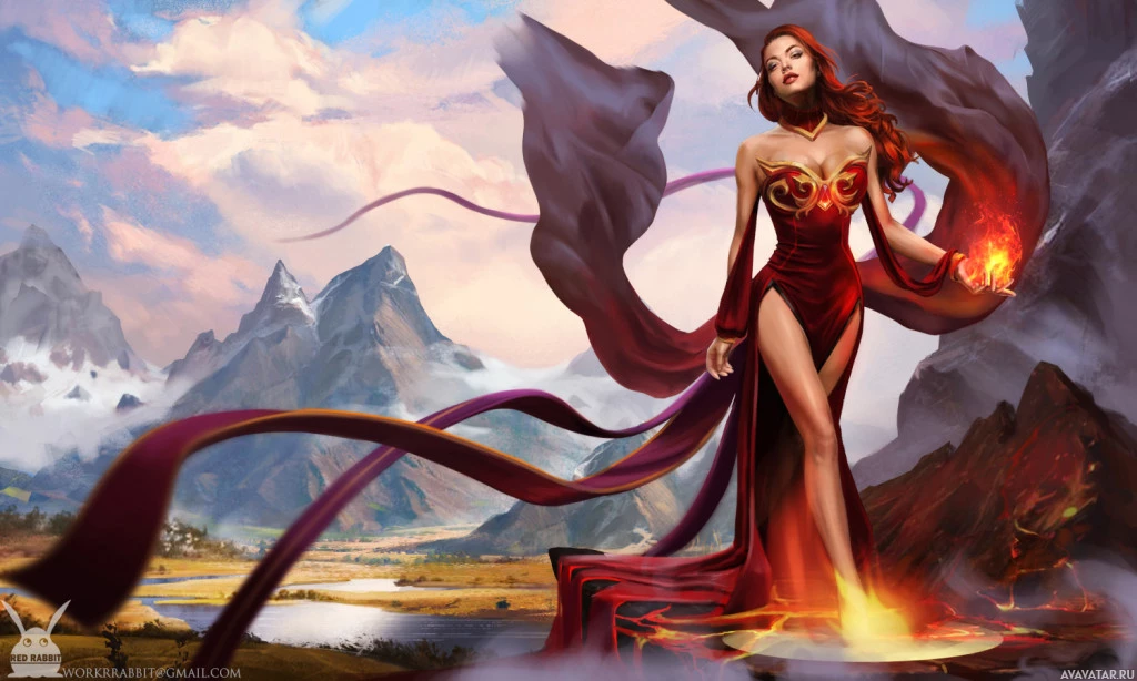 red hair and is wearing a dress, which suggests she might be at an event or performing in some way. There are elements associated with fire, such as flames and possibly fire-related objects like wands or staffs, which could imply a connection to magic or a character that uses fire-
