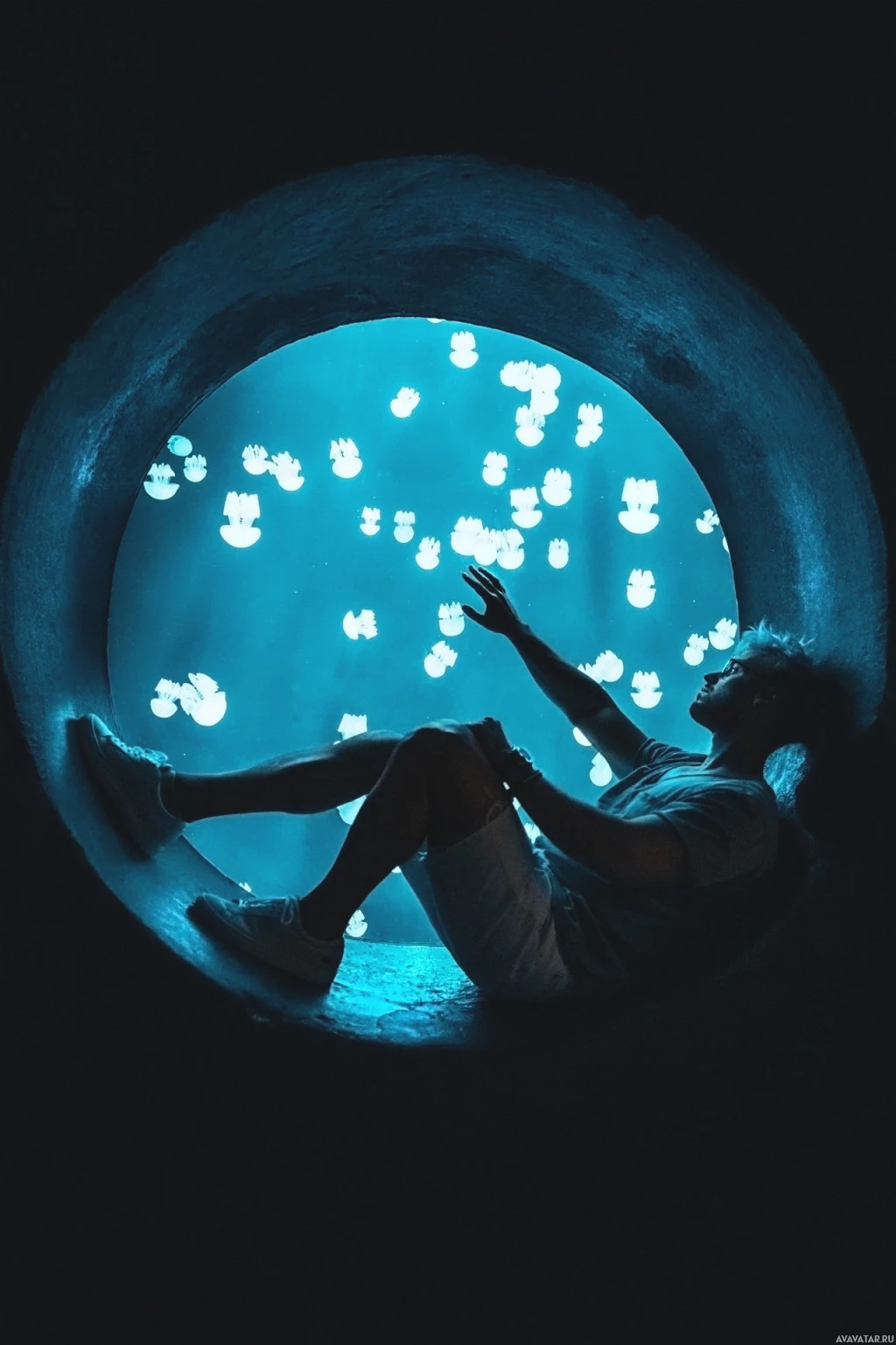 surrounding environment has a blue-green hue, suggesting a nighttime setting with artificial lighting. It's a visually intriguing composition that combines elements of nature with