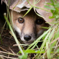 The picture shows a fox peeking out from behind what appears to be an overturned container or pipe. The fox's eyes are wide and alert, and it has a furry coat that is typical for this species.