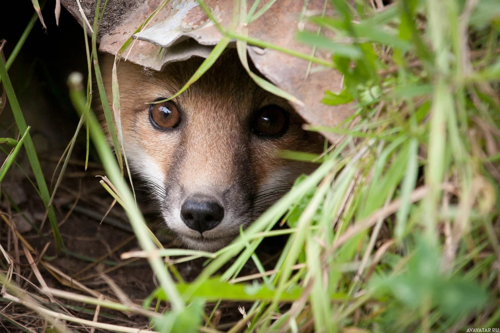 На снимке изображена лиса, выглядывающая из-за того, что кажется перевернутым контейнером или трубой. Глаза лисы широкие и бдительные, и она имеет пушистую шерсть, которая типична для этого вида.