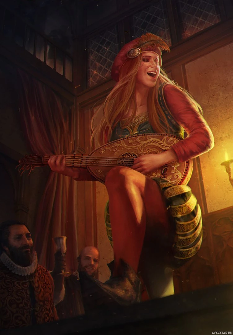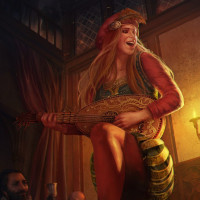 the video game "The Witcher" series, featuring a character named Priscilla. She is depicted playing a lute, and there are other characters present in the background, possibly part of