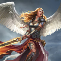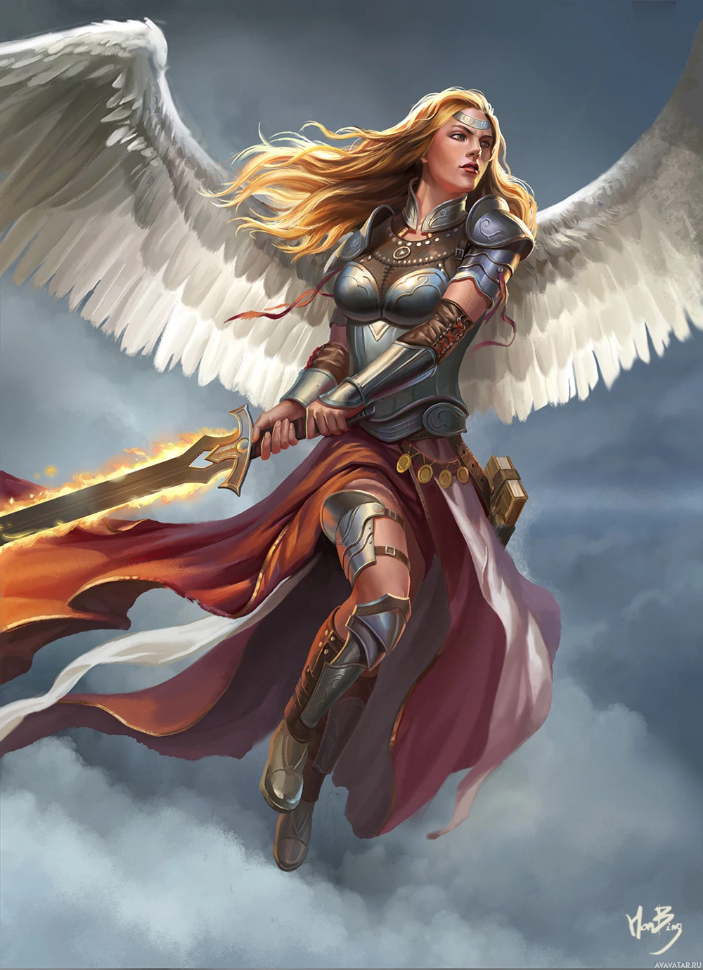 an angelic warrior. She is equipped with a sword, suggesting she might be ready for combat or defense. Her outfit includes armor and wings that are characteristic of