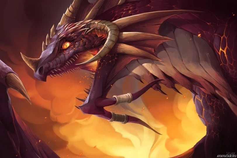 sharp teeth, wings, and a tail, which are typical features of dragons in fantasy genres. The background suggests a fiery or volcanic environment, which aligns with the typical habitat for such