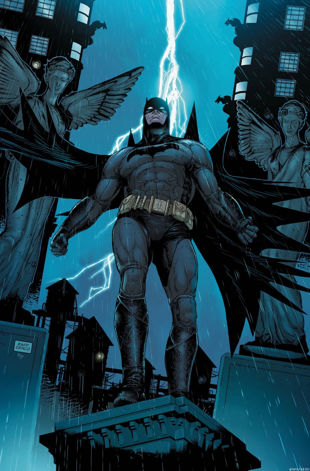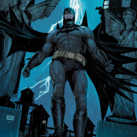 a muscular build, wearing a dark-colored suit and cowl that are typical for the Batman character. He is facing forward with his cape spread out behind him. In the background, there is lightning striking down from above, contributing to