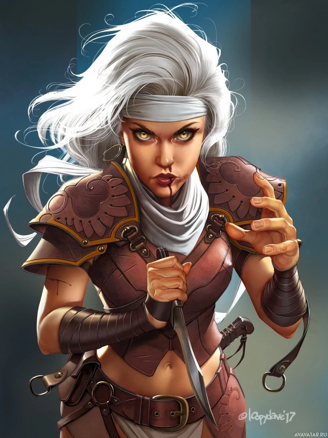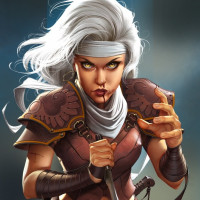 white hair, a scowl on her face, and is dressed in what appears to be ancient or fantasy-style clothing. The overall style of the illustration suggests it could be from a graphic novel, comic book,