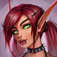 red hair and pointed ears, which are typical characteristics for elves in fantasy media. Her eyes have an unusual green glow, suggesting she might possess some