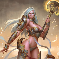 white hair and is wearing a body armor with a golden color, reminiscent of ancient warrior garb. In her right hand, she holds a staff that appears to have some magical or mystical properties. Her attire also includes what seems like a cape or cloak flowing behind her, suggesting movement or