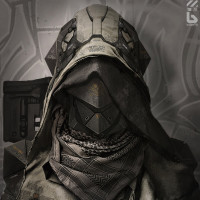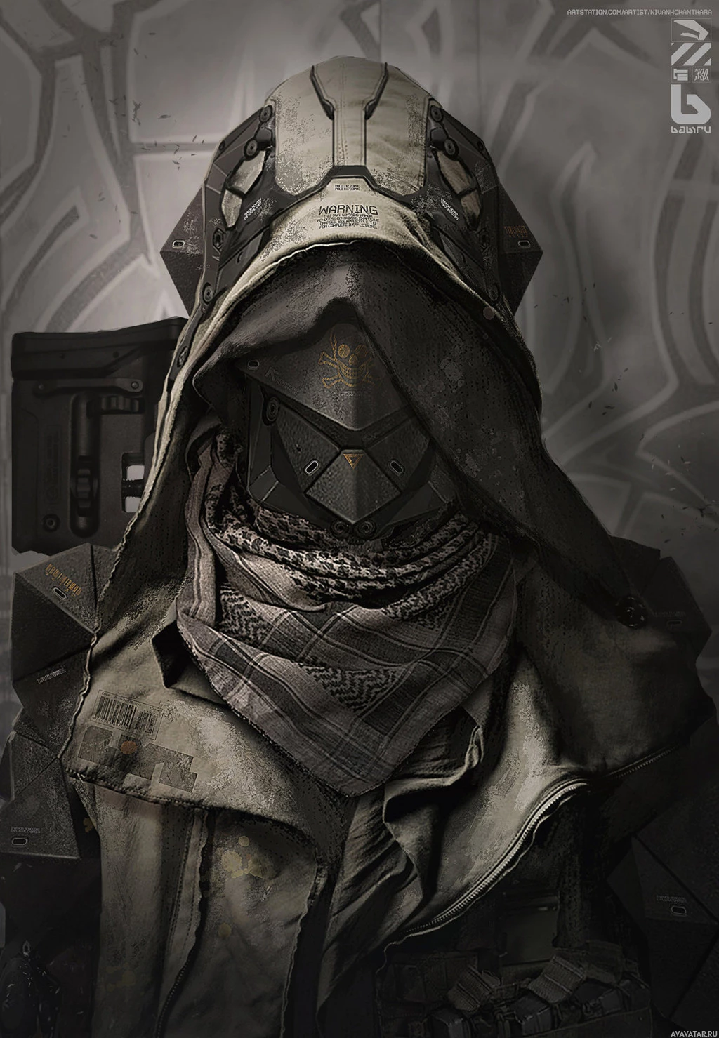 The image depicts a character wearing a hood and a mask. The mask covers the entire face, including the eyes, with only the nose and