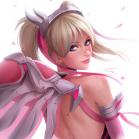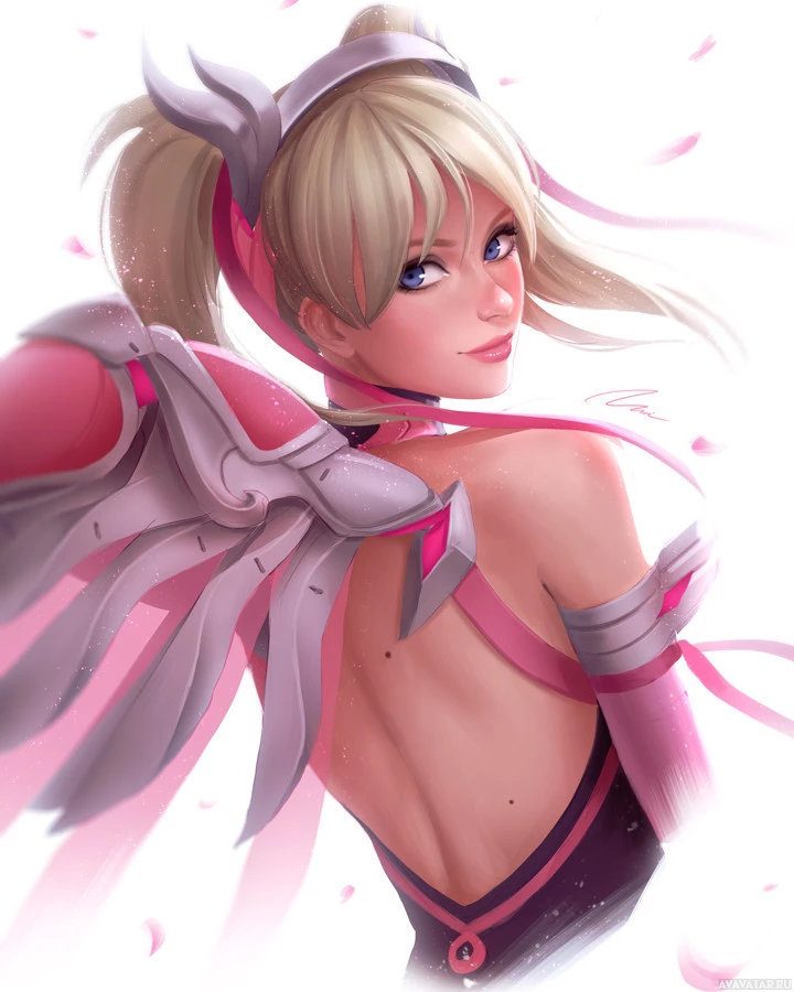 the video game Overwatch, specifically Mercy. She is depicted from behind with her wings spread out and holding a staff. Her hair is styled in ponytails secured with what appears to be pink scrunchies, and she's wearing