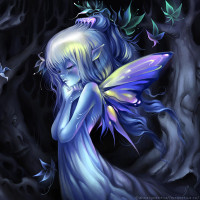 a dark forest or woodland setting with twisted tree trunks and what appears to be a sleeping or resting posture of the fairy, who is looking down, possibly towards the ground. The overall atmosphere of the image is one of serenity and