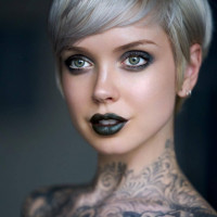 white hair and tattoos covering their body. They are wearing makeup that includes