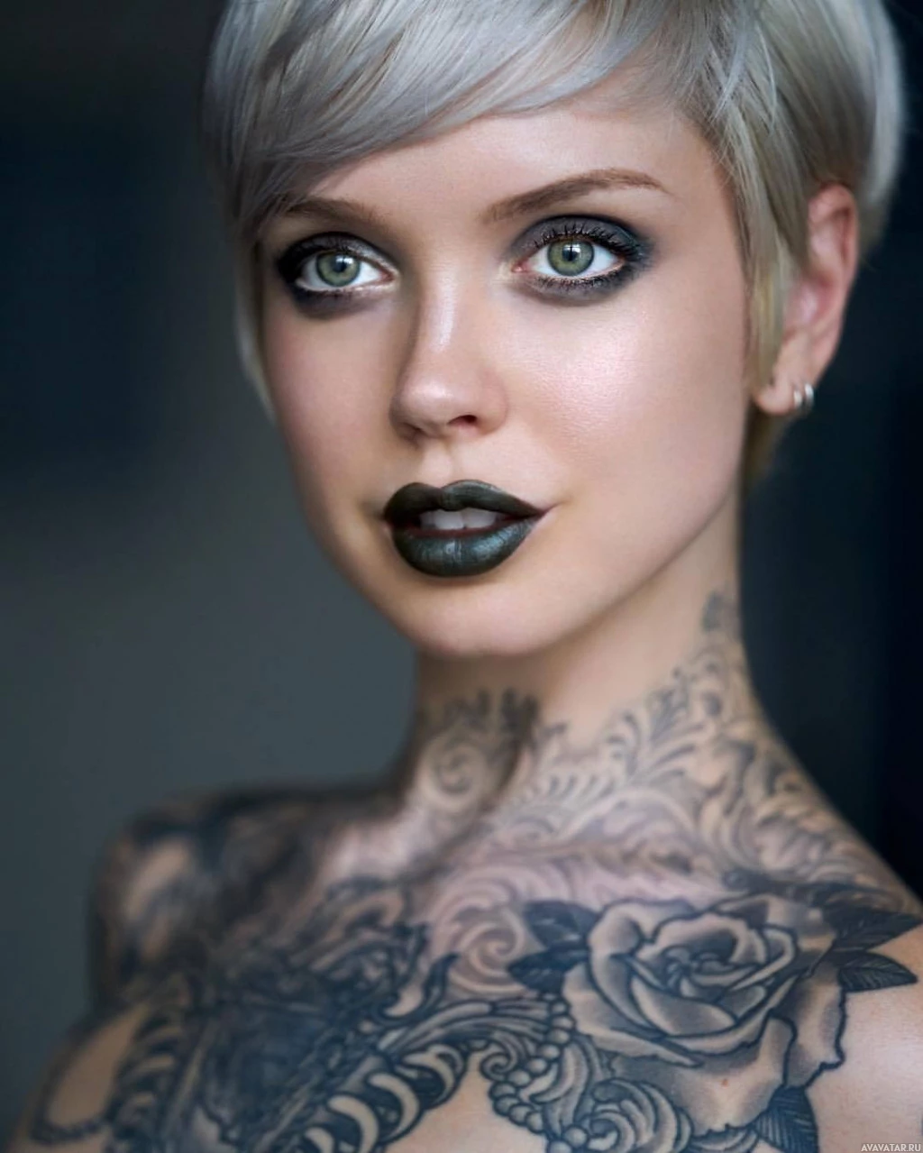 dark lipstick, which contributes to an edgy and modern appearance. The person is looking directly at the camera, and there's