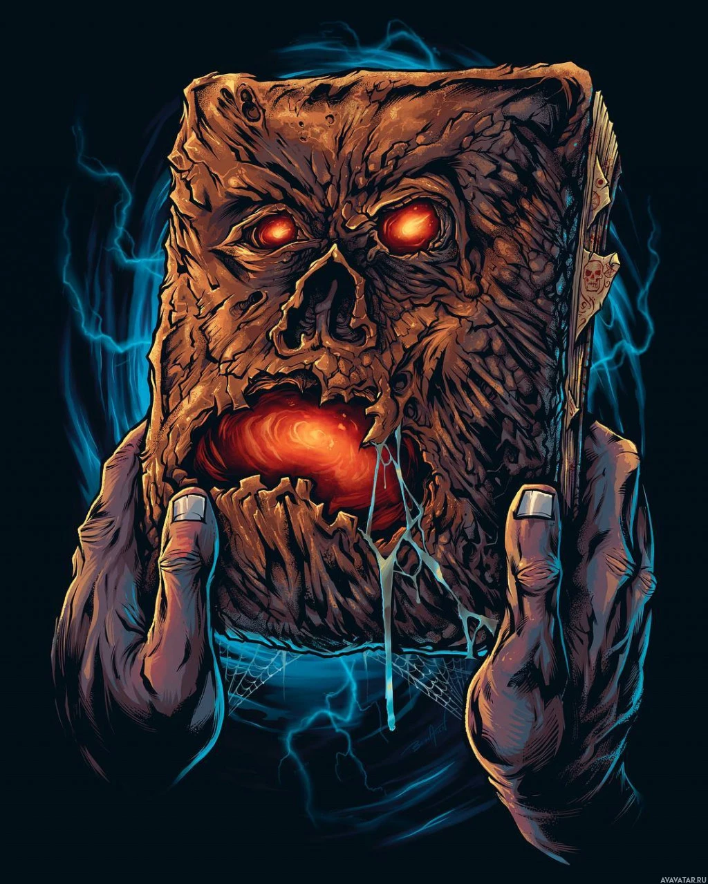 red eyes, appearing as if it's emerging from the pages of an open book. This suggests a theme that combines horror elements with literature or knowledge, possibly referencing