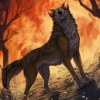 The image depicts an illustration of a wolf standing in the foreground, with its gaze directed forward. The background features a fiery scene, suggesting a wildfire or intense heat, which adds to