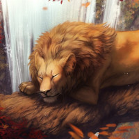 The image depicts a lion lying down on a rock surrounded by autumnal trees and foliage. It appears to be a digital artwork rather than a photograph, given the level of detail and the surreal quality to the scene.