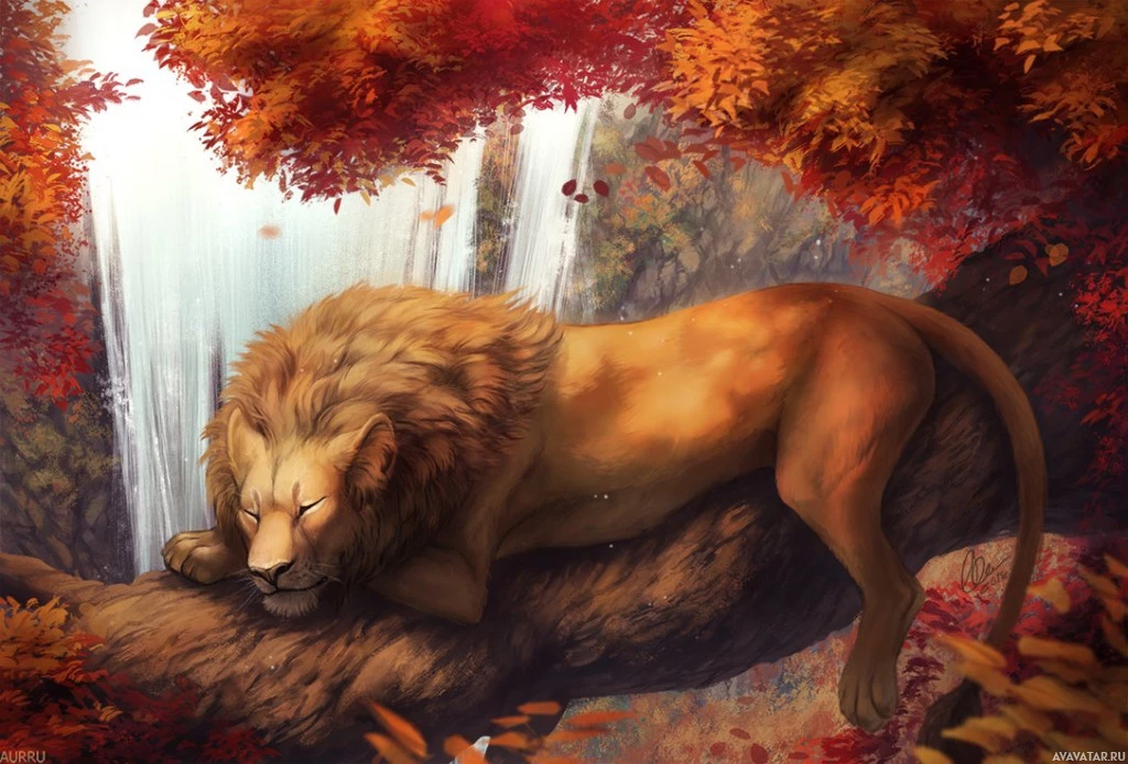 Картинка показывает льва, лежащего на скале в окружении осенних деревьев и листвы. Это скорее цифровое произведение искусства, чем фотография, учитывая уровень детализации и сюрреалистическое качество сцены.