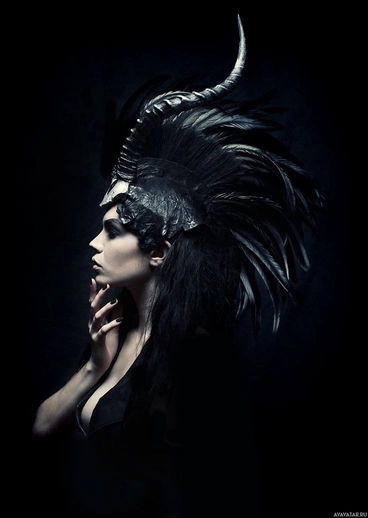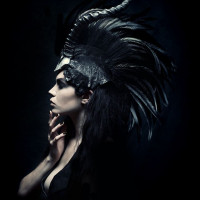 closed eyes, giving off a contemplative or meditative vibe. She is wearing a headpiece with feathers that add a unique and perhaps symbolic element to her appearance. Her expression seems thoughtful, and the overall lighting gives the photograph